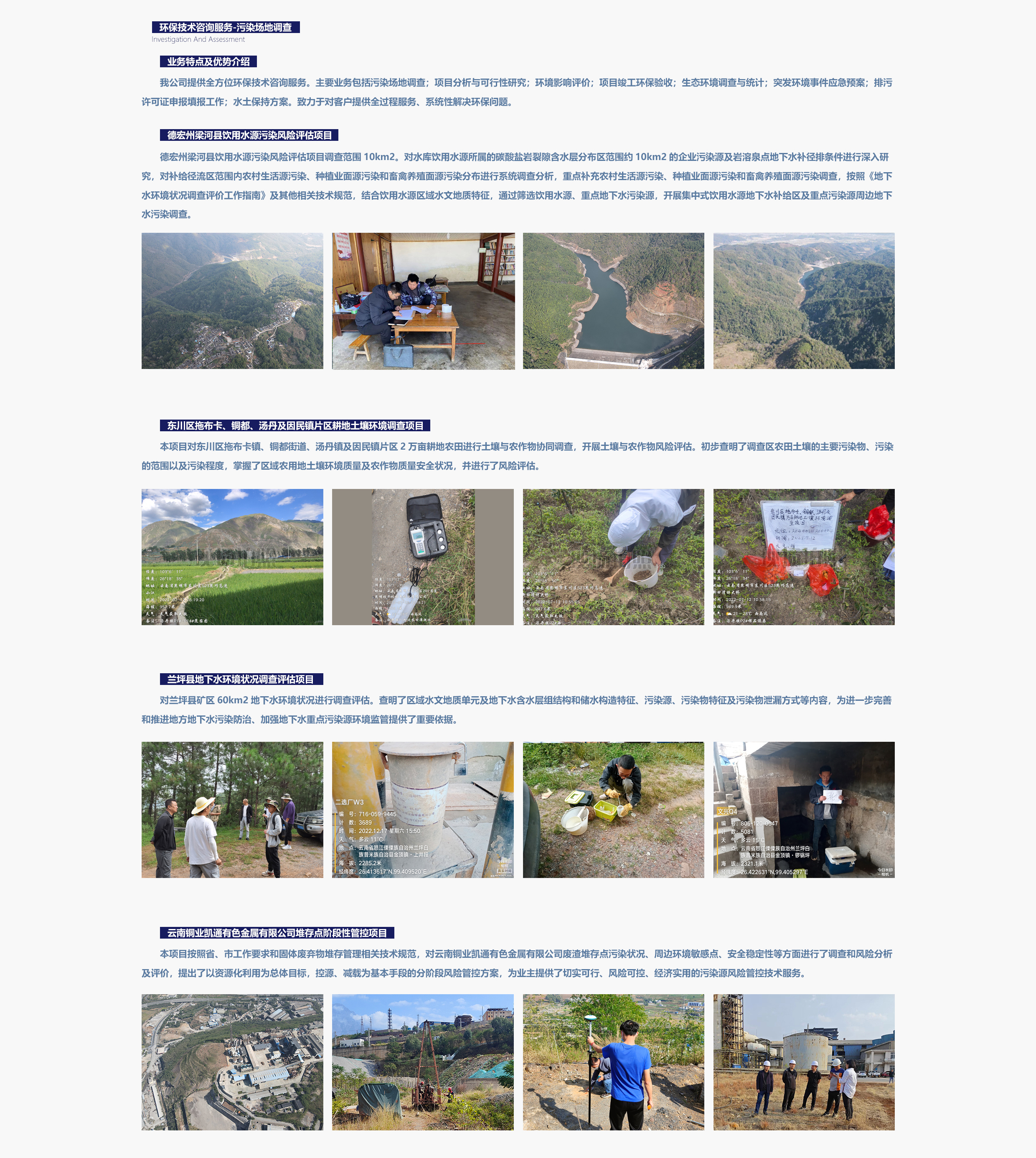 綜合服務(wù)項(xiàng)目業(yè)績(jī)覆蓋生活垃圾及固廢處理處置、流域水環(huán)境綜合治理、農(nóng)村環(huán)境綜合治理、工業(yè)污染場(chǎng)地、農(nóng)用耕地土壤修復(fù)和礦山生態(tài)修復(fù)等領(lǐng)域。具有“環(huán)保工程專業(yè)承包三級(jí)”資質(zhì),獲得質(zhì)量管理體系、AAA企業(yè)信用等級(jí)、國(guó)家及云南省科技型中小企業(yè)等證書,并取得16項(xiàng)專利。