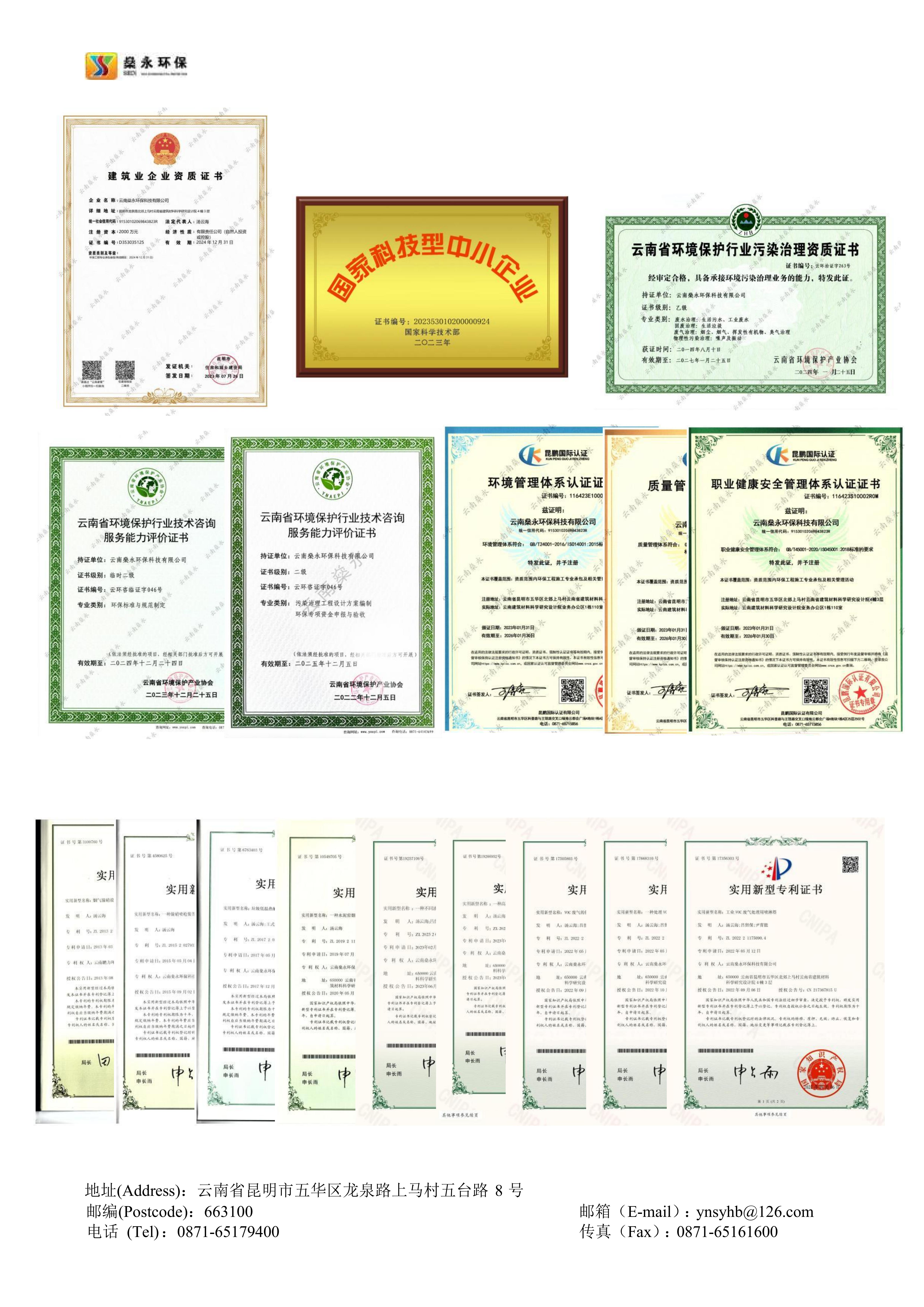 燊永公司堅持“創(chuàng)新、協(xié)作、共贏”的價值觀,以“專業(yè)、專心、專注”為服務(wù)理念,以“求實、求是、求精”為質(zhì)量宗旨,為客戶提供優(yōu)質(zhì)、高效、貼心的服務(wù)。公司獲得國家專業(yè)部門頒發(fā)的《環(huán)境工程專業(yè)承包三級》資質(zhì)、《污染治理乙級》資質(zhì)、《企業(yè)信用等級A級》證書、《云南省科技型中小企業(yè)》認(rèn)定證書、《ISO9001/GBT50430質(zhì)量管理體系》證書、《ISO14001環(huán)境管理體系》證書、《ISO45001職業(yè)健康安全管理體系》證書等多項榮譽和多項的專利技術(shù)。