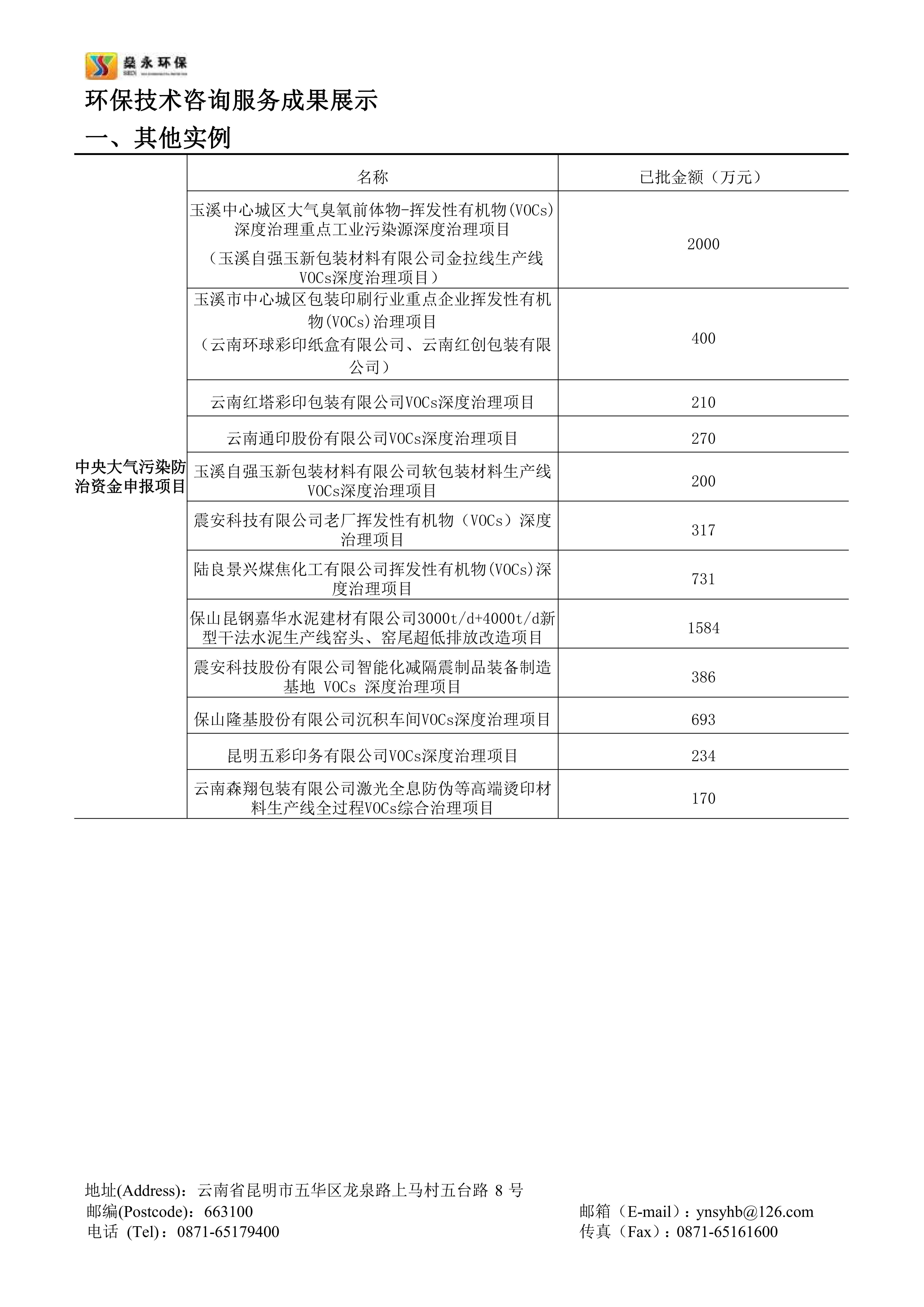 截止2023年10月,公司幫助云南省多個行業(yè)企業(yè)成功申報的中央大氣污染防治資金已入庫項目共計20余個,申報項目已獲批總資金近一億余元。公司承接的云南省內(nèi)中央大氣污染防治資金申報項目申報成功率高,成效顯著,服務(wù)細(xì)致高效,在云南省中央大氣污染防治資金申報領(lǐng)域具有豐富的經(jīng)驗。